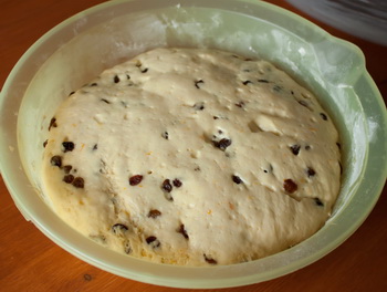 Муку тщательно растереть со сливочным маслом. В полученную смесь добавить дрожжи, сахар, специи, соль и предварительно измельченные сухофрукты. Теплое молоко взбить с яйцами и добавить в полученную смесь. Хорошо вымесить тесто, сформировать из него шар, завернуть его в пищевую пленку и оставить на 1 час.