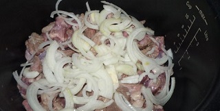Режем баранину на небольшие кусочки, лук чистим и режем полукольцами. В чашу мультиварки добавляем 1 ст.л. растительного масла и готовим 15-20 минут на режиме «жарка» при открытой крышке.
