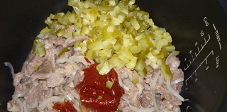 После добавляем соленые огурцы и томатную пасту. Все тщательно перемешиваем и готовим еще около 5 минут. Мелко режем половинку чеснока. Добавляем в чашу и заливаем водой. Все хорошо перемешиваем, устанавливаем на режим «тушение» на 1,5-2 часа.