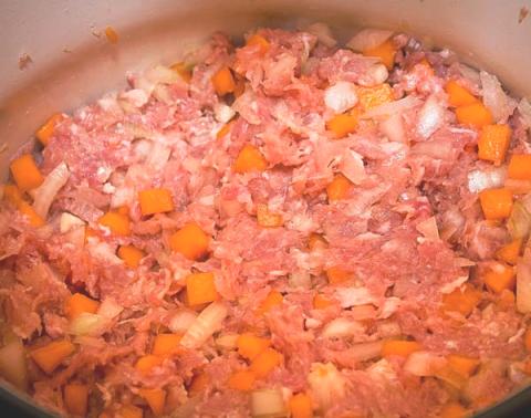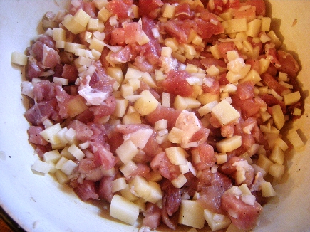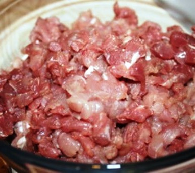 - Мясо и жир порубить мелкими кубиками.