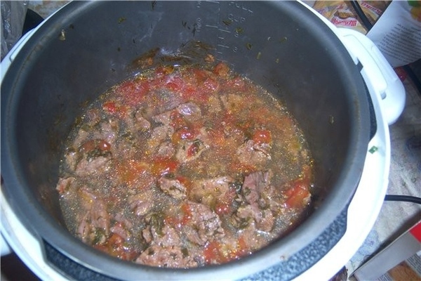 После этого перевести мультиварку на режим «Тушение» и добавить 100 мл воды или бульона, чтобы мясо начало тушиться. Затем в емкость мультиварки к мясу выложить овощи слоями, в следующей последовательности: морковь, лук, картофель, болгарский перец, перекладывая каждый слой овощей баклажанами. Сверху положить помидоры или томатное пюре, на Ваше усмотрение.