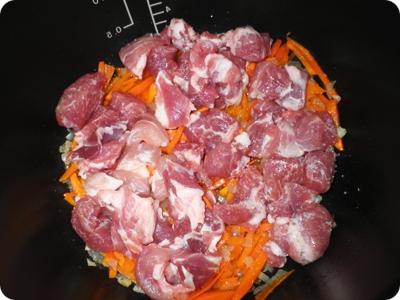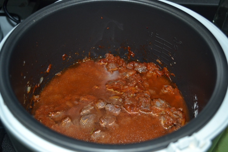 Затем в емкость опускают вымытое и нарезанное кусочками мясо, посыпанное солью и красной паприкой, и несколько минут слегка поджаривают в режиме «Тушение», после чего понемногу подливают 0,5 л воды и тушат почти до готовности. Когда мясо практически сварится, к нему кладут нарезанный кубиками картофель и натертую на крупной терке морковь, добавляют еще воды, протертый помидор (можно заменить ложкой томата или томатной пасты) и варят до полной готовности 20-25 минут.