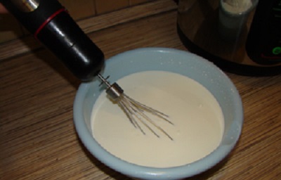 Немного подогреваем молоко, чтоб оно было слегка теплым, добавляем йогурт и перемешиваем венчиком. Если вы используете для приготовления сухую закваску, то ее необходимо немного развести с молоком, а потом влить в основной объем.