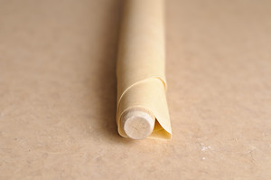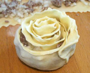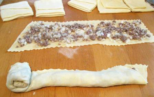 4) Розочкой: тесто раскатываем в большое полотно, разрезаем его на полоски, по центру полосок высыпаем дорожку из начинки, собираем и залепляем края, заворачиваем в рулет: