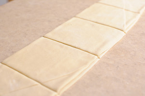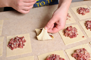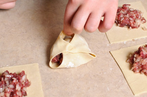 1) Конвертиком: раскатываем тесто, разрезаем его на квадратики (можно раскатывать по одному), залепляем конвертом, затем собираем края: