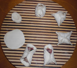 5. На пласты раскатанных кружочков (или квадратиков) выкладываем посередине по столовой ложке фарша и защипываем, как показано на фото. Вариантов того как заворачивать манты на самом деле очень много, и мы постараемся в разных рецептах этого блюда показать разные варианты защипки, ну а этот способ - самый легкий: