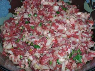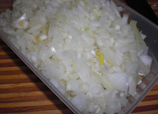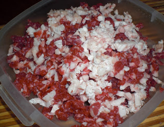 2. Замесив тесто, заворачиваем его в пищевую пленку или пакет, отставляем в сторону и начинаем готовить фарш. Для фарша очень мелко режем мясо, жир и лук, размешиваем, затем добавляем специи и вновь хорошо перемешиваем: