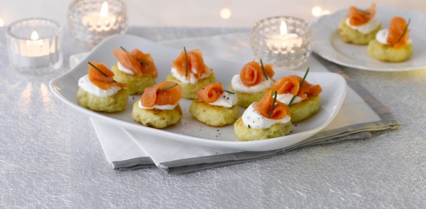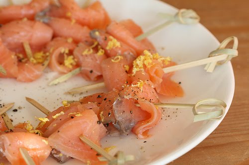 Канапе с семгой и блинчиками на шпажках