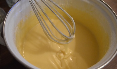 В глубокой посуде при помощи венчика смешиваем сметану, молоко, сахар и ванильный сахар. Добавляем остывшее растопленное масло и снова тщательно перемешиваем.