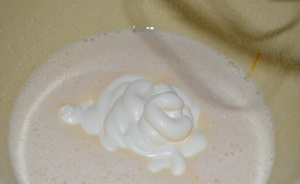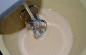 В полученную смесь добавить майонез и еще немного взбить. Постепенно добавить муку с содой.