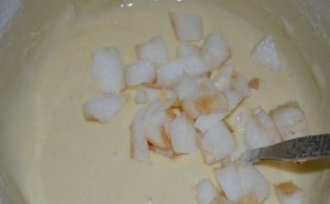 Очистить грушу, нарезать небольшими кусочками, добавить в полученное тесто и перемешать при помощи ложки.