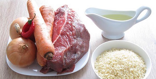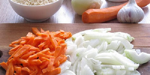 Как правило процесс приготовления любого блюда, в том числе и плова начинается с приготовления продуктов. В первую очередь необходимо промыть рис, очистить овощи, нарезать лук полукольцами, а морковь соломкой.