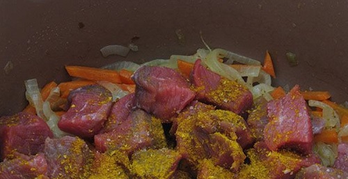 В мультиварку добавляем масло, включаем режим «Жарка» и добавляем туда лук. Обжариваме лук до прозрачности, добавляем морковь и жарим еще несколько минут. Добавляем кусочки мяса, посыпаем его специями и обжариваем с овощами, чтоб оно подрумянилось.