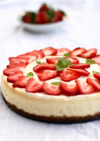 6. Тем временем, в миске смешайте сметану, сахар, ваниль и хорошо перемешайте. Выньте чизкейк из духовки через 30 минут после охлаждения, и с помощью кондитерского шпателя мягко и равномерно распределите крем по всей поверхности торта. Поставьте чизкейк обратно в духовку, чтобы он продолжил остывать в оптимальной для себя температуре в течение 30 минут. За это время крем тоже успеет немного впитаться. В общей сложности, после одного часа охлаждения в духовке, возьмите чизкейк и осторожно выньте из водяной бани. Оставьте немного охладиться на столе, а затем накройте крышкой и поставьте в холодильник. Когда чизкейк полностью охладится (16-24 часа), форму разомкните, и освободите чизкейк. Украсьте его ломтиками тонко нарезанной свежей клубники и подавайте!