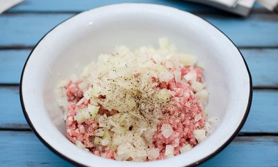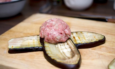 В емкости смешиваем фарш, лук, нарезанный мелкими кубиками, соль и перец. Баклажан моем, отрезаем хвостик, нарезаем вдоль ломтиками, ширина которых составляет 0,5 см.