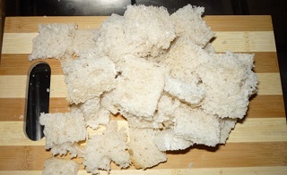 С приготовленного хлеба срезаем корку и мякиш режим кубиками.