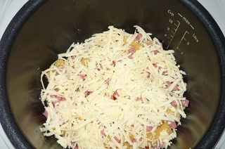 Выкладываем сверху кусочки колбасы и посыпаем сыром. Включаем режим «выпечка» и готовим в течении 40-50 минут. Готовое блюдо можно посыпать зеленью и подавать к столу.
