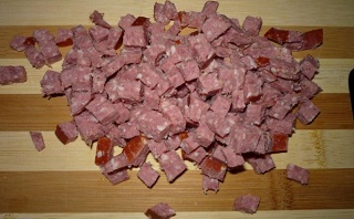 Режем колбасу и трем на терке сыр.