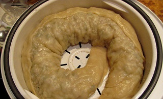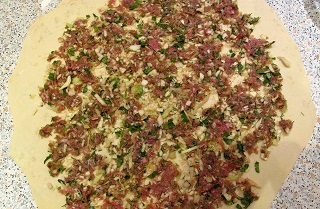 В фарш добавляем лук и соль и тщательно его перемешиваем. Достаем наше тесто, раскатываем его в равномерную лепешку и выкладываем на нее фарш. Полученное тесто сворачиваем в рулет и защипываем края.