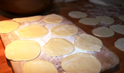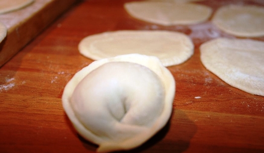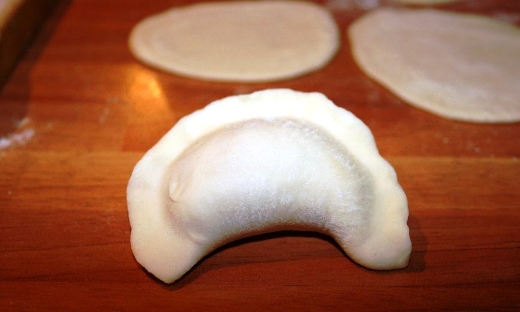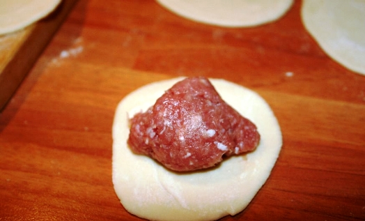 - Поместите чайную ложку мясной начинки, приготовление которой можно подсмотреть в рецепте готовки домашних пельменей, в центре кружочка из теста, сложите вдвое и хорошенько защипите края, чтобы не оставалось отверстий: