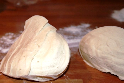 - Разрежьте готовое тесто на две части: