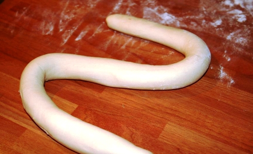 - Одну заверните в полиэтиленовый пакет, иначе тесто высохнет, а вторую раскатайте в длинную «змею» 2,5 см в диаметре: