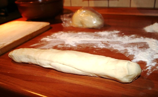 - Разрежьте «змею» с интервалами опять же в 2,5 см, и раскатайте кусочки на посыпанной мукой поверхности до ширины примерно в 8 мм (тесто не должно быть слишком тонким):