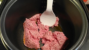 Включить мультиварку на режим «выпечка» на 20 минут. Добавить мелко нарезанный лук, через 5-7 минут добавить фарш. Обжариваем лук и фарш до изменения цвета.