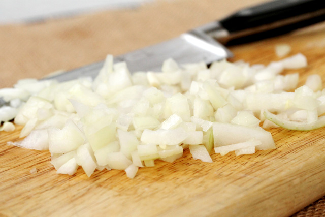 - Лук тонко нарубить, так же измельчить, как и