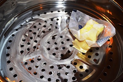 - В кастрюлю из под мантоварки залить наполовину воду, поставить на сильный огонь.