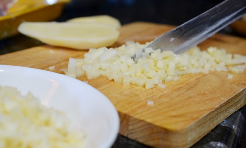 - Тонко нарезать лук. Можно проделать это и в кухонном комбайне. Картофель порезать мелкими кубиками: