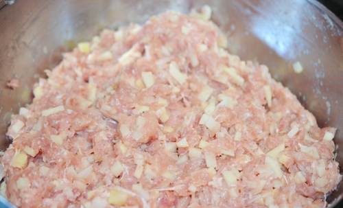 - В большой миске смешать фарш, картофель, лук, соль и специи. Все хорошо перемешать:
