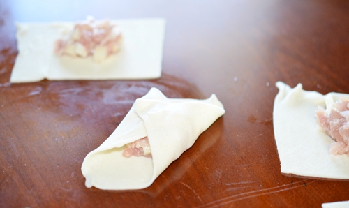 - Выкладывать в каждый квадратик по 1 столовой ложке (с верхушкой) начинки. Залепить можно так, как указано в рецепте лепки мант: