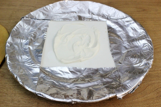 - Оберните тарелку, диаметром чуть больше коржей, алюминиевой фольгой.