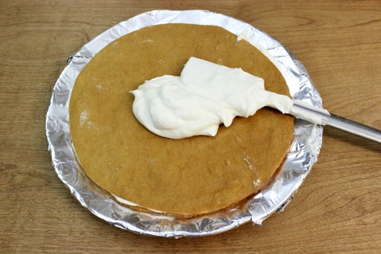 - На каждый корж выкладывайте примерно по ¼ чашки крема и равномерно распределите: