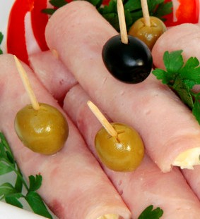 - Зеленый лук на минуту обработать термически в микроволновке. Перевязать немного размягченным луком полученный рулет с ветчиной. Готовое мясное канапе можно подавать со шпажками, или без них...