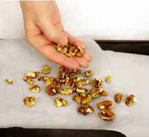 Грецкие орехи, высыпать на противень и поместить в разогретую до 160С духовку всего на несколько минут. За это время постараться несколько раз перемещать их. После того, как орехи остынут порубить их блендером или тяжелым ножом.