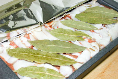 Предварительно приготовленную форму, застелить двумя слоями фольги и выложить нарезанными полосками из бекона. Аккуратно выложить внутрь полученный фарш. Верх паштета тоже закрыть беконом и положить лавровый лист. Накрыть фольгой, поместить в форму большего размера, которая наполнена водой и запечь в течении 1,5 ч. в духовке разогретой до 190С.