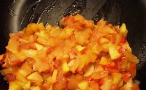 Яблоки чистим, нарезаем небольшими кусочками, обжариваем на небольшом огне, присыпаем сахаром и перемешиваем.