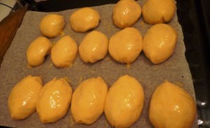Пирожки выкладываем на предварительно смазанный маслом противень, швом вниз. Оставляем для расстойки на 10-15 минут. Смазываем взбитым яйцом и отправляем в духовку на 20-25 минут до образования румяной корочки.