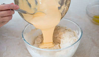 2. Тесто. В блюде объемом не менее 3 л, взбиваем венчиком 5 яиц и 1 стакан сахара, просеиваем через сито 4 стакана муки и хорошо вымешиваем. Добавляем щепотку соли. В полученную смесь добавляем опару и еще раз тщательно все перемешиваем. Если добавить в уже готовое тесто немного водки или коньяка, то можно рассчитывать на то, что алкоголь поможет дрожжам сделать тесто более рыхлым и увеличит срок хранения готового кулича.