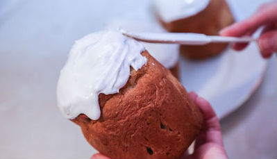 5. Для украшения взбиваем в миксере до состояния однородной массы белого цвета один белок, лимонный сок и сахарную пудру. Полученной смесью смазываем остывший кулич. Используя глазурь другого цвета, пишем на готовом куличе ХВ и посыпаем цукатами и другими украшениями на свое усмотрение.