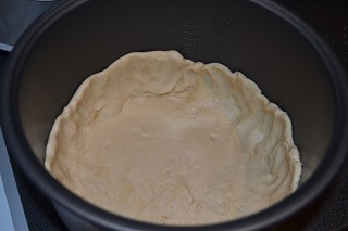 Разморозить слоеное тесто, взять один пласт и раскатать толщиной приблизительно в 0,5 см. Поместить тесто в смазанную маслом чашу мультиварки.