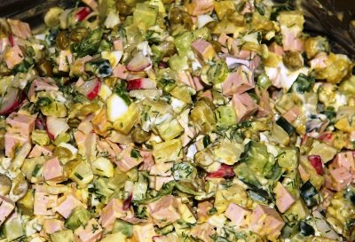 Калорийность окрошки на квасе по данному рецепту составляет 47,49 ккал (на 100 гр.).