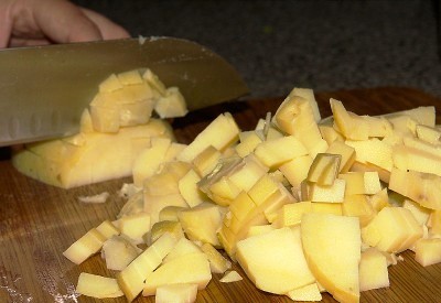 Шаг 2. С картофелин снять мундир, нарезать кубиками, после переложить в емкую кастрюлю: