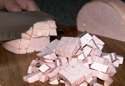 Шаг 3. Колбасу также нарезать в виде кубиков, добавить к картофелю: