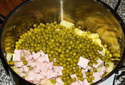 Шаг 1. Подготовить ингредиенты: отварить картофель и яйца (сварить вкрутую) заранее, слить жидкость из гороха.