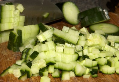 Шаг 5. Огурцы порезать кубиками, если они перезревшие, удалите семена и кожицу, отправьте в кастрюлю: