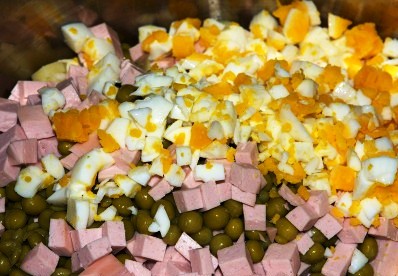 Шаг 6. Яйца, отваренные вкрутую, нарезаются такими же кубиками что и остальные составляющие, и так же перекладываются в емкость: