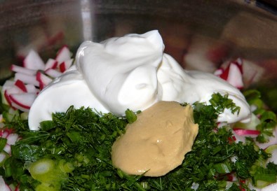 Шаг 9. Добавить в овощно-колбасную мешанину специи, положить 2 ст.л. горчицы и около 5 ст.л. сметаны (или больше, если хотите):